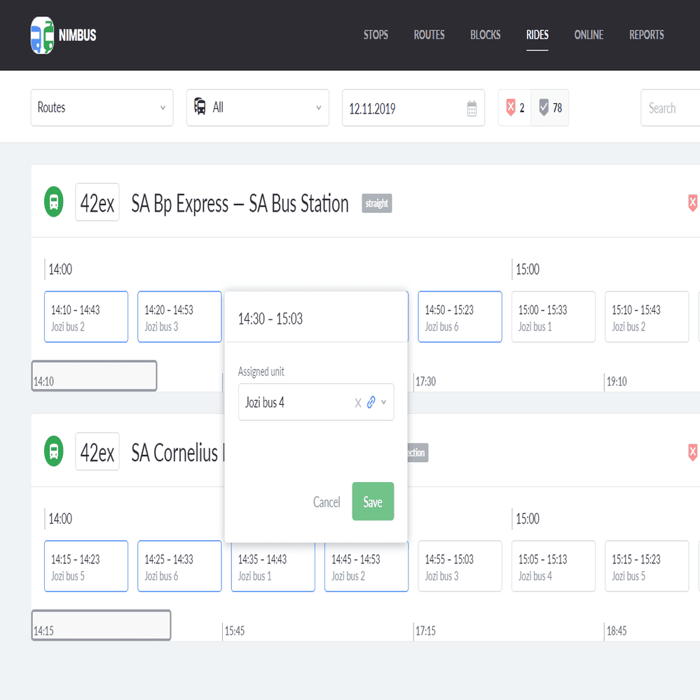 NimBus - is a web application designed for monitoring public passenger transportation, which performs a number of important tasks automatically. The main functionalities of the application include route optimization, distribution of vehicles across routes, monitoring compliance with schedules, and configuring a flexible access control system.